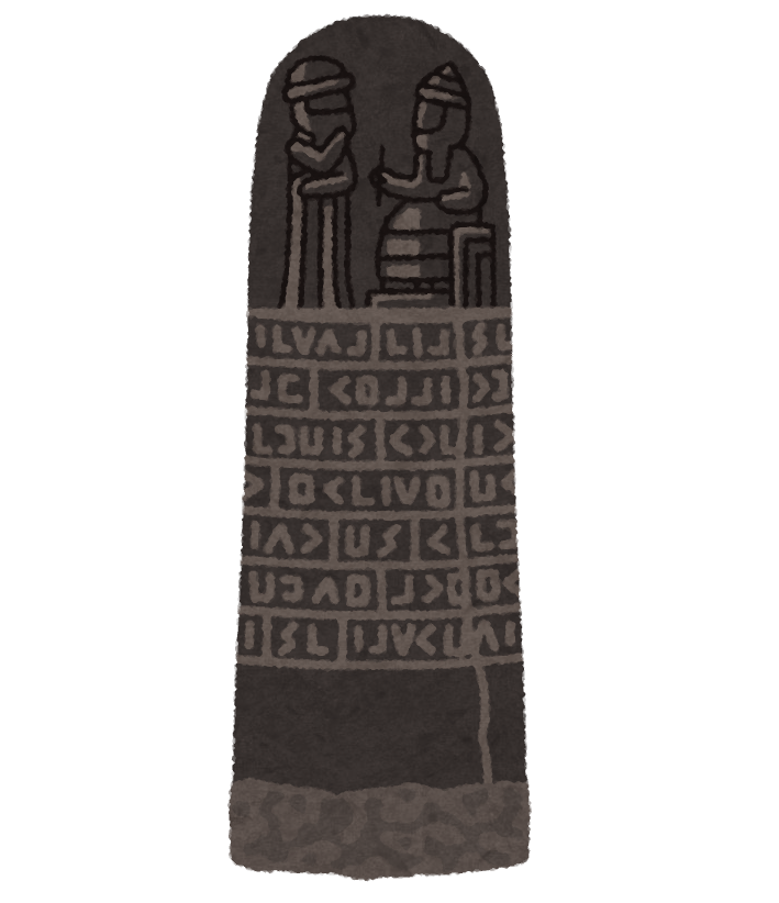 古代バビロニアのハンムラビ法典が楔形文字で記された石柱のイラスト(こんなのまである いらす○やは凄いね)