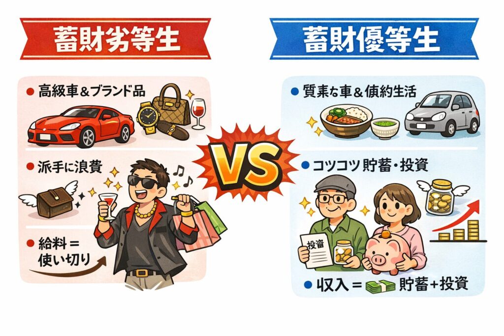 - 普通の持ち家、中古の国産車、質素な生活 → 純資産:3000万円以上